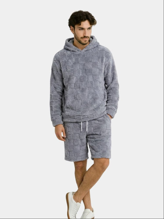 Neues, schmal geschnittenes, lässiges Herren-Set mit Rundhalsausschnitt, langen Ärmeln, Shorts, quadratischem Karomuster und Fellbesatz, personalisierbar für Herbst und Winter